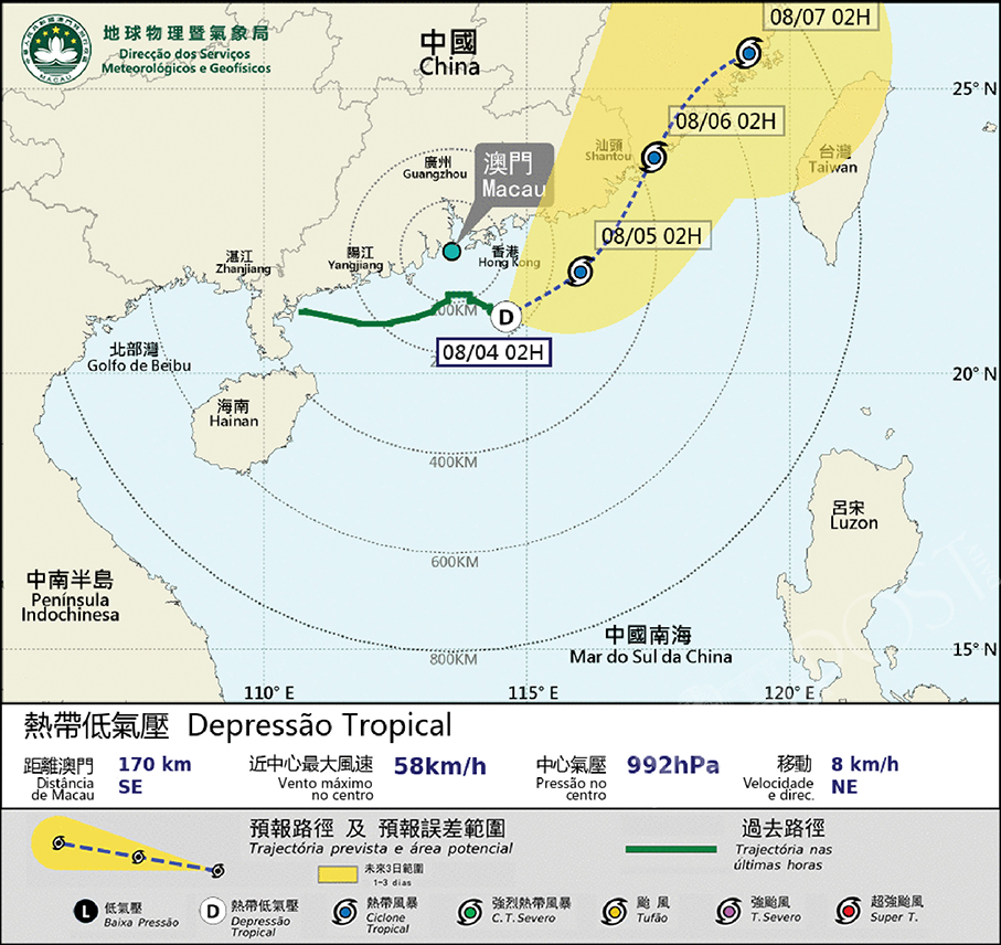 "The tropical depression south of the Pearl River Estuary continues to intensify, and its movement speed has been slow in the past few hours. It is forecast that the tropical depression will stay within a 150-km radius of Macau in the next 12 hours, and it will generally move towards the eastern coast of Guangdong. Affected by... the tropical depression, there will be occasional heavy showers and thunderstorms in Macau, with winds occasionally reaching Level 6 with gusts. Therefore, the Tropical Cyclone Warning Signal No. 3 will remain in effect tonight, and the probability of issuing higher signals is low. The public are advised to pay close attention to the change in weather and the latest news about the storm. On the other hand, the possibility of flooding caused by a storm surge is low since the astronomical tide level is low these days. However, the public should still pay attention to the possibility of flooding caused by heavy rains," the bureau said in a statement at 5:30 p.m.