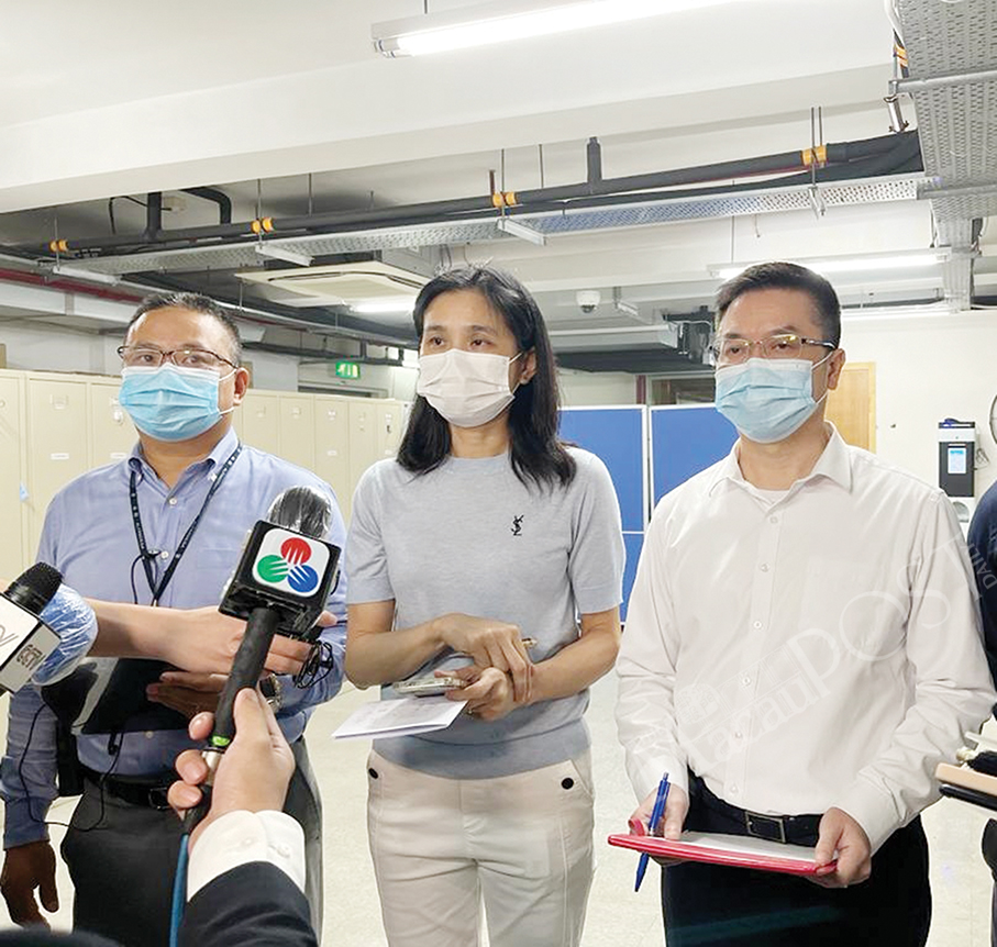 Macau Customs Service officer Lei Iok Fai (from left to right), Water and Marine Bureau (DSAMA) Director Susana Wong Soi Man and Fire Services Bureau (CB) Commissioner Leong Iok Sam talk to reporters late last night about the fire which broke out in the Inner Harbour yesterday evening. Photo: Maria Cheang Ut Meng