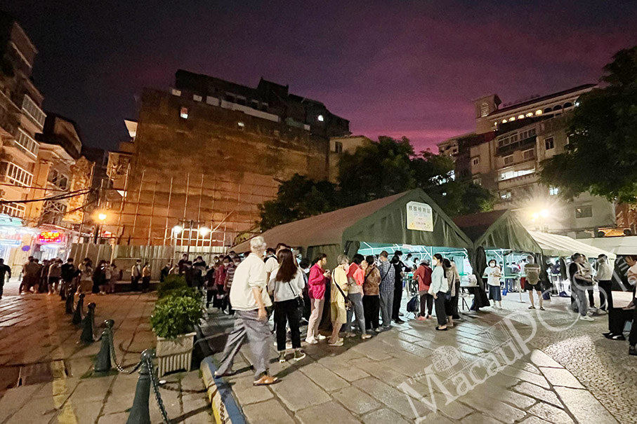 Residents queue to be tested for COVID-19 outside a nucleic acid testing (NAT) station in Largo do Pagode do Bazar’s sitting-out area (where the Hong Kung Temple is located) in the Inner Harbour area last night. – Photo: Maria Cheang Ut Meng