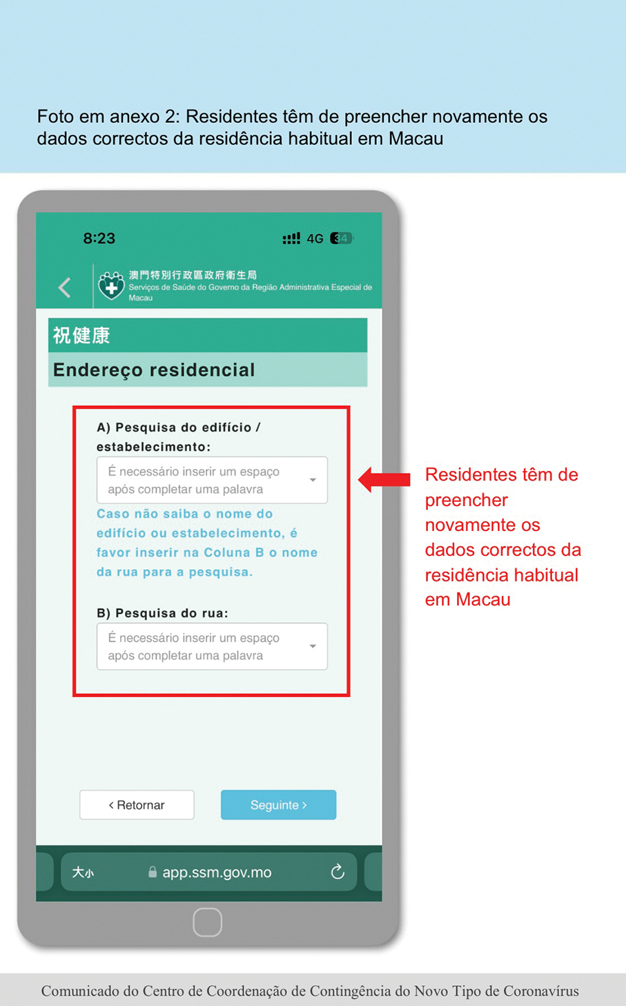 The Novel Coronavirus Response and Coordination Centre announced in a statement yesterday that from next Wednesday members of the public must update their “usual” local place of residence on their Macau Health Code, adding that the option of “allowing the Health Bureau (SSM) to retrieve their registered address from the Identification Services Bureau (DSI)” will be removed.