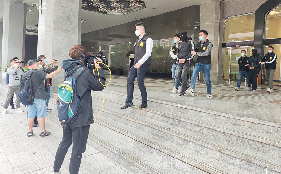 Judiciary Police (PJ) officers escort the hooded suspects from the PJ headquarters to a PJ vehicle yesterday. – Photos: William Chan
