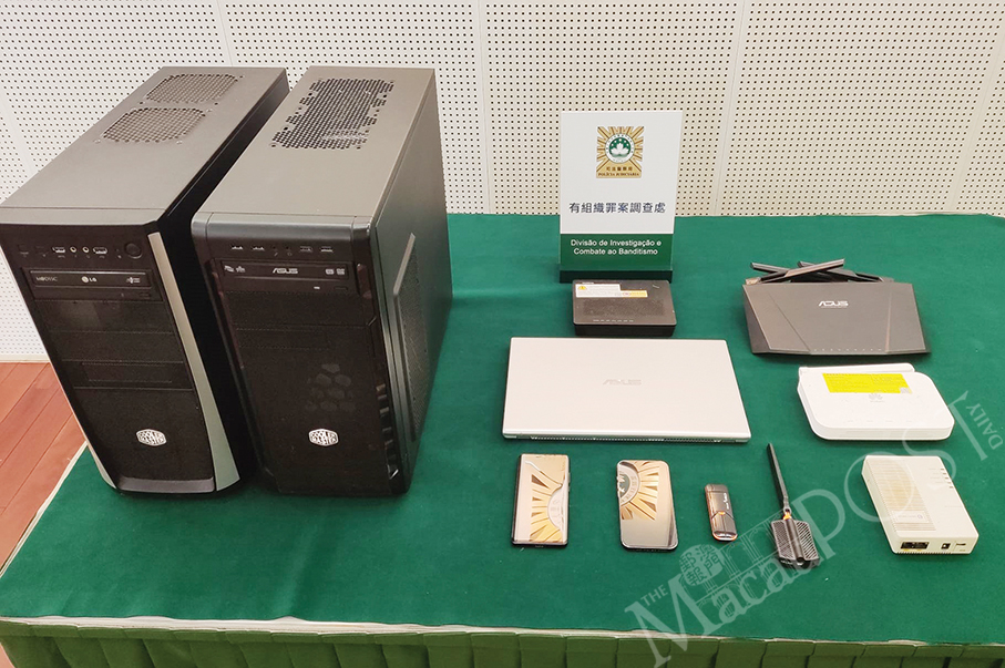 Electronic devices seized from the two suspects are displayed in a pressroom of the Judiciary Police (PJ) headquarters yesterday.