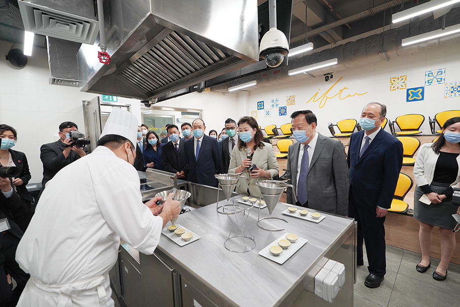 State Council Hong Kong and Macao Affairs Office (HKMAO) Director Xia Baolong (second from right) watches a chef preparing desserts during yesterday’s visit to the Macao Institute for Tourism Studies (IFTM) main campus on Mong Ha Hill.
