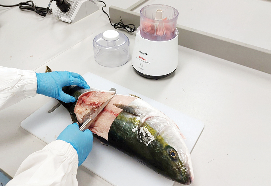This handout photo provided by the Municipal Affairs Bureau (IAM) yesterday shows an IAM official inspecting a fish imported from Japan.