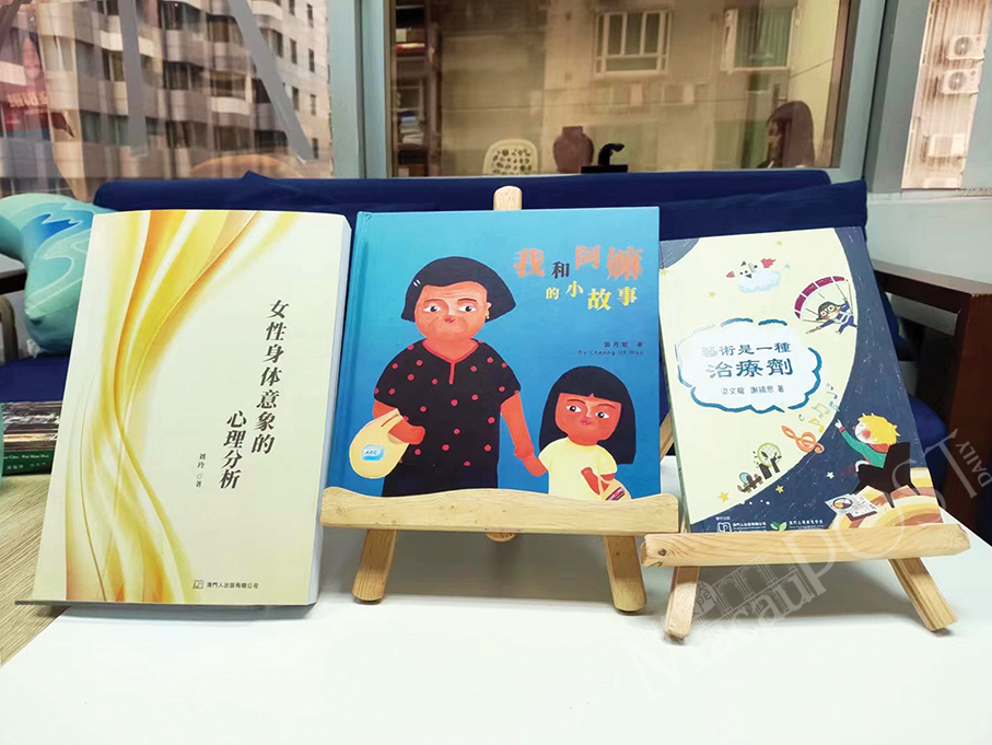 This photo taken last week shows the three exhibited books – “Our Precious Moments” (middle), “Psychological Analysis of Female Body Images” (left) and “Art as a Therapeutic Agent”. –Photo: William Chan