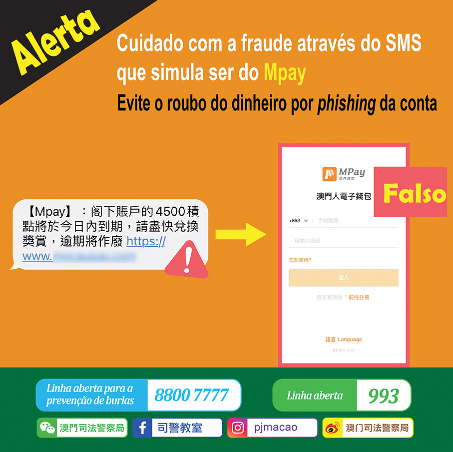 The Judiciary Police (PJ) said in a statement yesterday that residents have filed complaints about receiving SMS messages posing as local mobile payment platform MPay, claiming that their reward points would expire soon but could be redeemed for gifts, so as to trick victims into logging onto a fake website to obtain their personal information and credit card details.