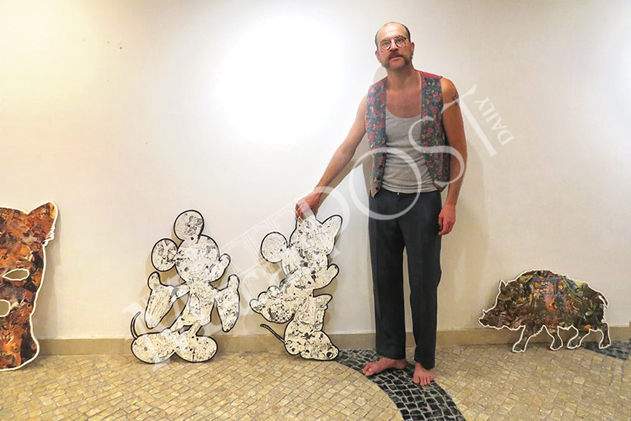 Burry Buermans poses with Mickey and Minnie Mouse in the basement of the Portuguese Bookshop, the venue for the exhibition, last week.