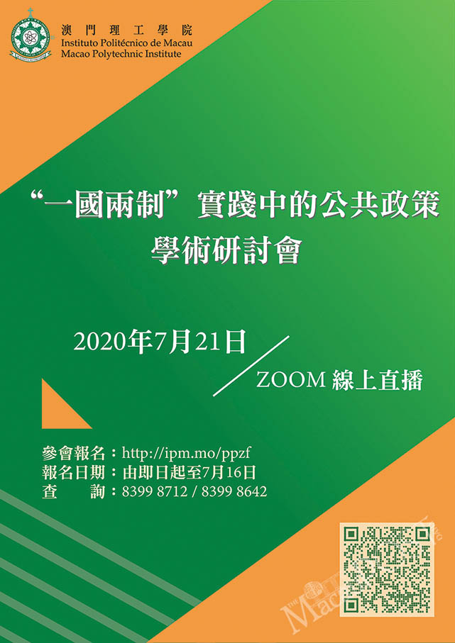 Registration is free and open until tomorrow, with a limited number of spaces on a first-come-first-served basis. Online registration is available at http://ipm.mo/ppzf. For enquiries send an email to UPDS@ipm.edu.mo or call 8399 8712/8399 8642 to contact Ms. Mak or Ms. Chong of the institute’s One Country, Two Systems Research Centre.