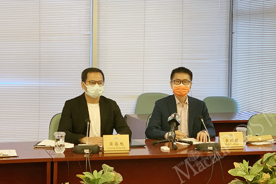 Lawmaker Leong Sun Iok (left) and the head of the Legislative Assembly’s (AL) Follow-up Committee for Public Finance Affairs, businessman Mak Soi Kun, pose before yesterday’s press briefing at the Legislative Assembly Building. Photo: Prisca Tang