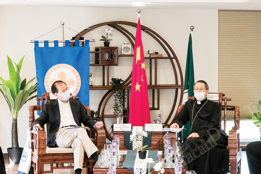 Central People’s Government Liaison Office in the MSAR Fu Ziying (left) meets with Macau Catholic Diocese Bishop Stephen Lee Bun-sang on the Ilha Verde campus of the University of Saint Joseph (USJ) last Wednesday morning. Photo: USJ