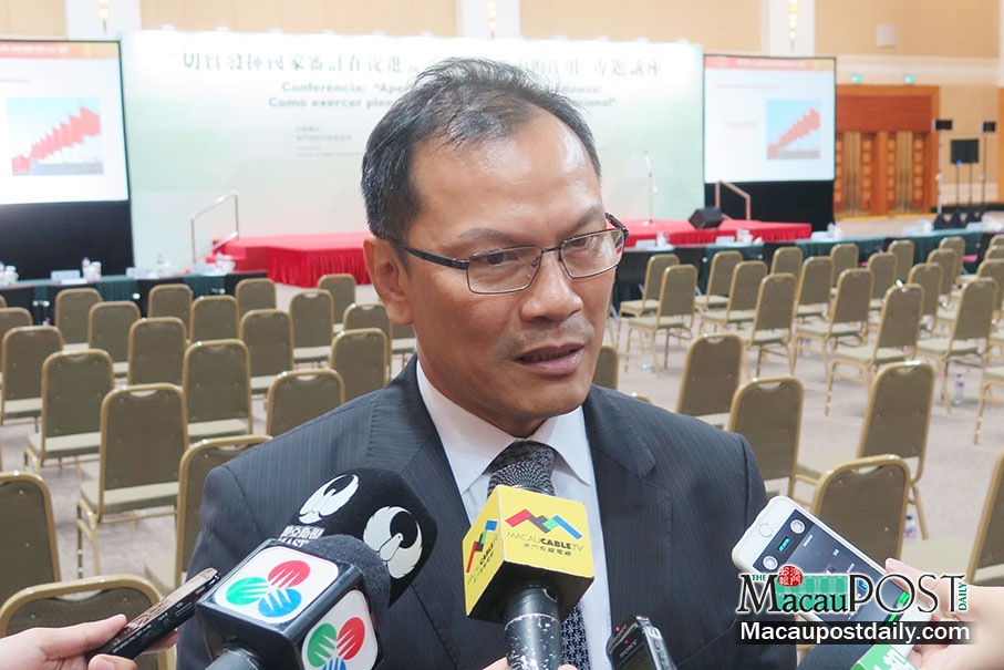 Lands, Public Works and Transport Bureau (DSSOPT) Director Li Canfeng speaks to reporters after attending a lecture by Liu Jiayi, the central government’s auditor-general, at the Macau East Asian Games Dome in Cotai yesterday. Photo: Davis Ip