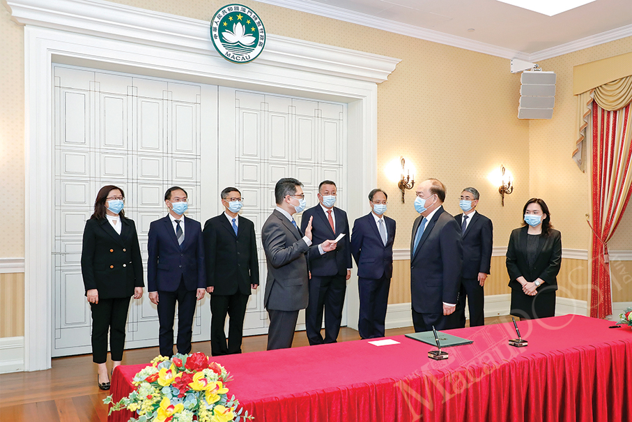 Witnessed by Chief Executive Ho Iat Seng (front, right), Legislative Assembly Electoral Affairs Commission President Tong Hio Fong (front, left) is sworn in at Government Headquarters yesterday, as the commission’s five other members Inês Chan Lou (from left to right, behind) Kou Peng Kuan, Lai U Hou, José Maria da Fonseca Tavares and Iong Kong Leong as well as Secretary for Administration and Justice André Cheong Weng Chon and the chief-of-cabinet of Ho’s office, Hoi Lai Fong, look on. Photo: GCS