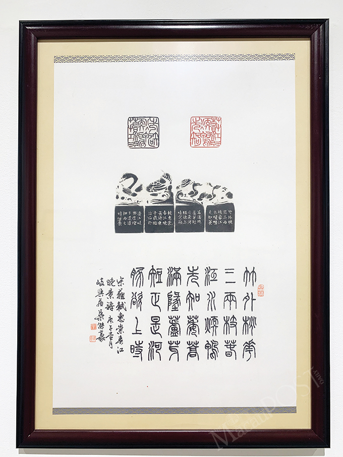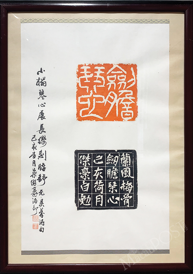 Ye specialises in Chinese calligraphy, painting and seal carving. His work “24 Stories of Filial Piety” won the Grand Prize of the Jury Award and the Excellent Artwork Award in the Collective Exhibition of Macau Artists 2019. Twenty-three pieces and sets of Ye’s work are displayed including seal carvings, seals and calligraphy, created between 2019 and this year, exemplifying his “deft artistry and ingenious selection” of seal materials, according to the statement.