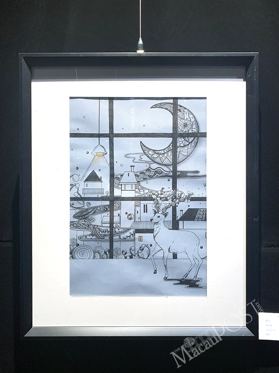 The four artists are fresh Visual Arts graduates from the tertiary education institution’s School of Arts, namely Chan Kit U, Chen Xuelin, Lei Ka Kei and Pun Weng I, displaying a total of 10 pieces of work including line drawings, watercolours, oil paintings and photographs, according to a statement by 10 Fantasia.