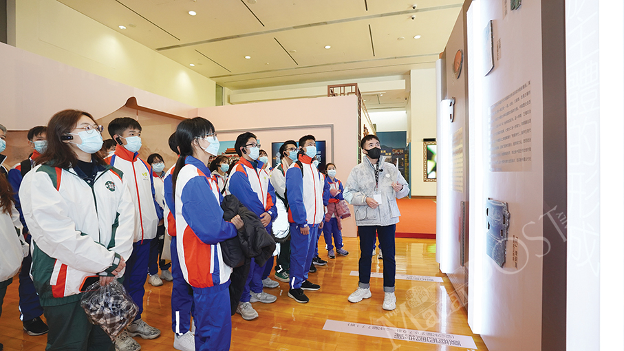 This photo taken and provided by the Judiciary Police (PJ) on Saturday shows teens from the Community Safety Youth Leader Programme and Youth Fight Crime Programme listening to a patriotic education base guide at the Macau Handover Gifts Museum in Nape.