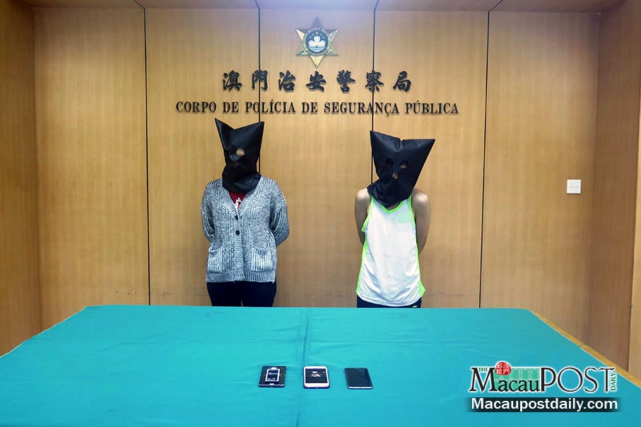 This handout photo provided by the Public Security Police (PSP) yesterday shows the two hooded suspects posing in a pressroom at a police station, with evidence on display.