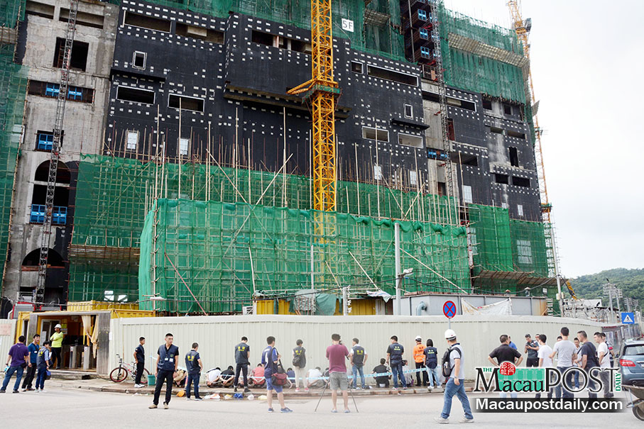Public Security Police officers watch 10 illegal workers caught at the Lisboa Palace construction site in Cotai yesterday. Photo: Iong Tat Choi