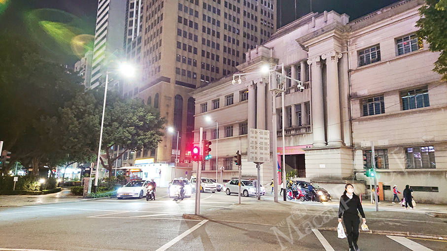 A woman crosses a traffic light-controlled crossing outside the Old Courthouse in Avenida da Praia Grande last night – as the light for pedestrians is on red.