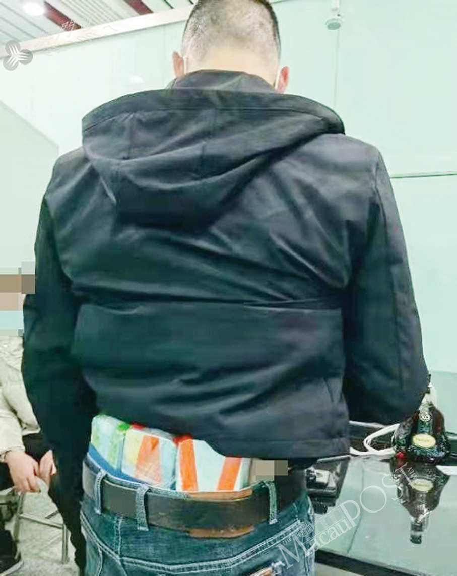 This undated handout photo provided by the Gongbei Customs yesterday shows how a man had hidden Maotai bottles around his waist in his attempt to smuggle the bottles into Zhuhai via the checkpoint on Monday.