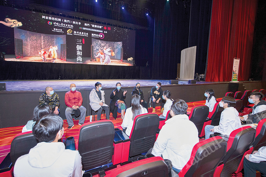 CNTC Feng Li shares her experience with attending guests and students after the Macau premiere of the “Three Monks” performance at Broadway Theatre.