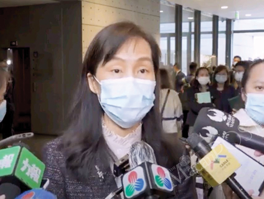 Secretary for Social Affairs and Culture Elsie Ao Ieong U talks to reporters at the Macau Cultural Centre (CCM) in Nape on Friday.