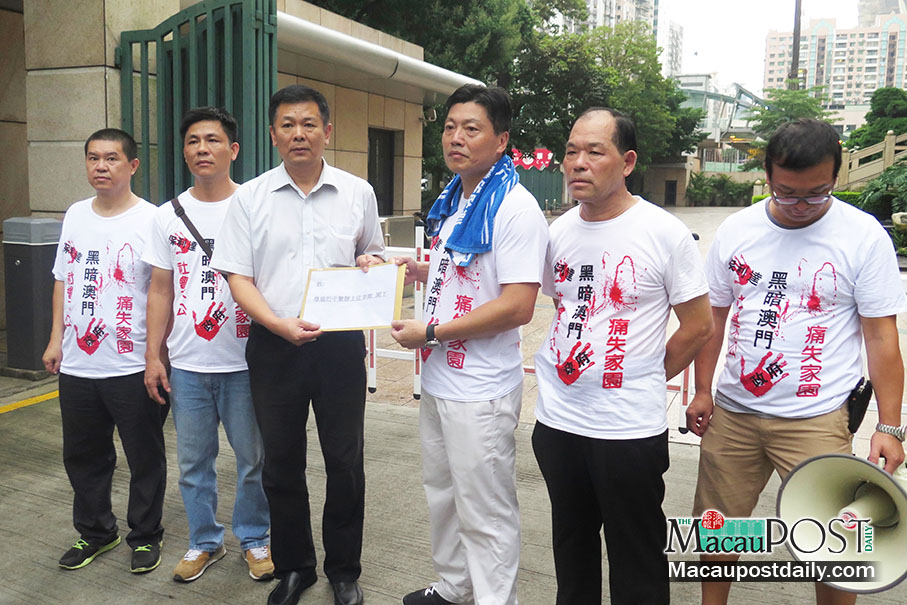 Pearl Horizon Condominium Owners United Association President Kou Meng Pok (third from right) submits a petition to an official outside Central People’s Government Liaison Office in Zape yesterday while fellow protesters look on. Photo: Davis Ip