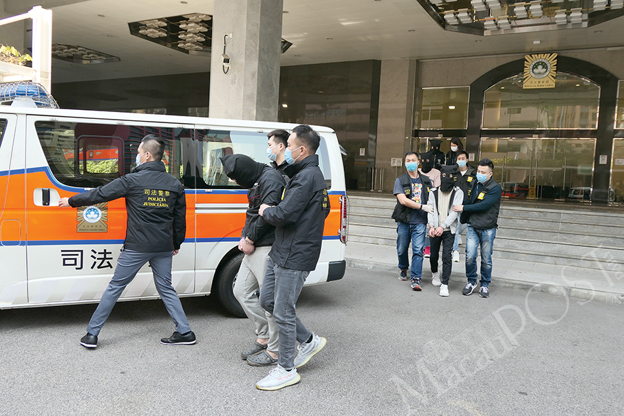 The four hooded drug suspects are escorted by the Judiciary Police (PJ) officers from the PJ headquarters to a vehicle yesterday. Photos: Iong Tat Choi