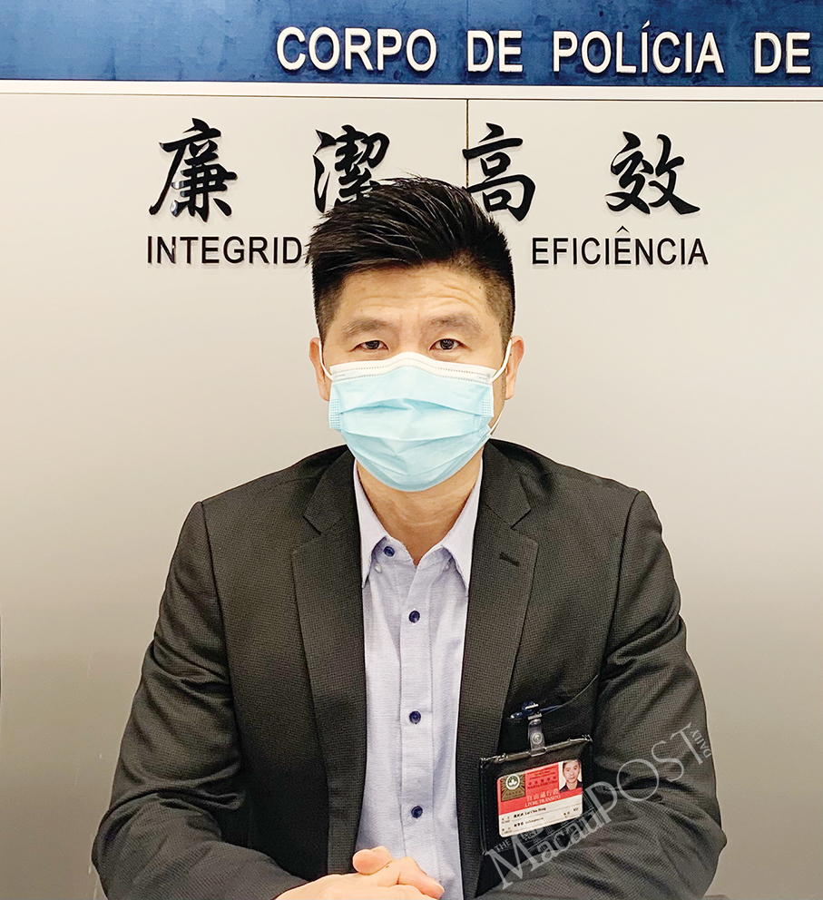 Judiciary Police (PJ) spokesman Lai Chio Hong poses during yesterday’s regular press conference at the Public Security Police (PSP) pressroom.