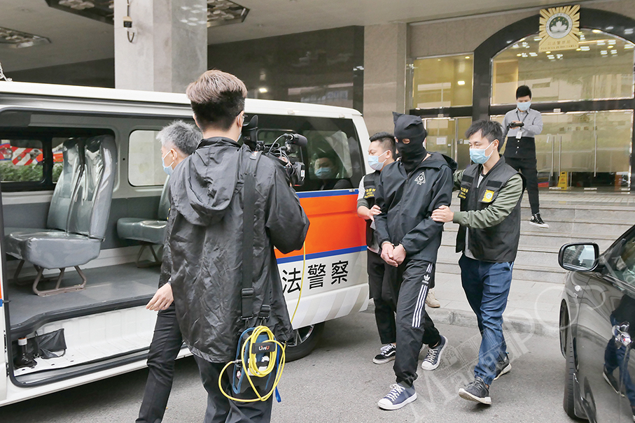 The hooded theft suspect is escorted by the Judiciary Police (PJ) officers from the PJ headquarters to a vehicle yesterday. Photos: Iong Tat Choi