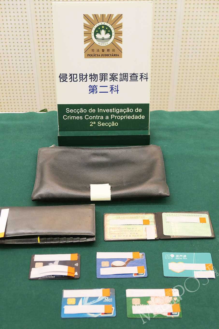 Evidence seized from the suspect such as a clutch bag, a wallet and a number of bank cards is displayed during yesteday’s special press conference at the Judiciary Police (PJ) headquarters.