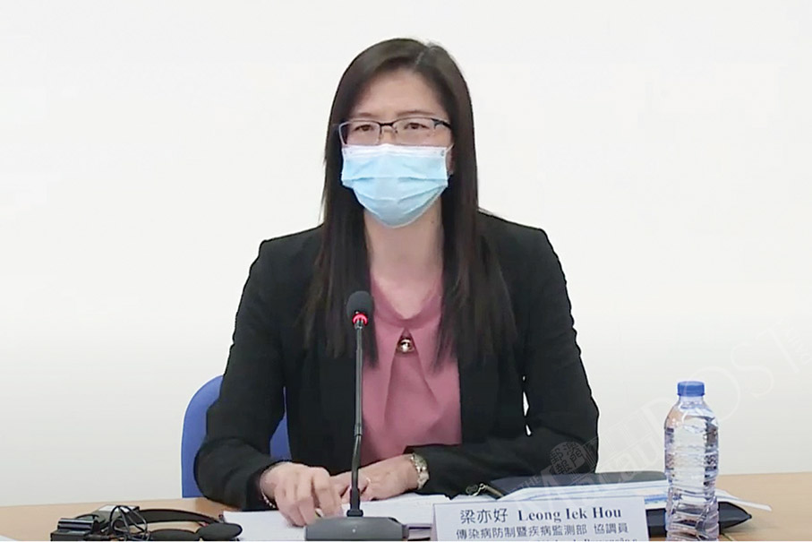 Health Bureau (SSM) Control of Communicable Diseases and Surveillance of Diseases Department Coordinator Leong Iek Hou addresses yesterday’s press conference about the city’s novel coronavirus situation. Photo: GCS