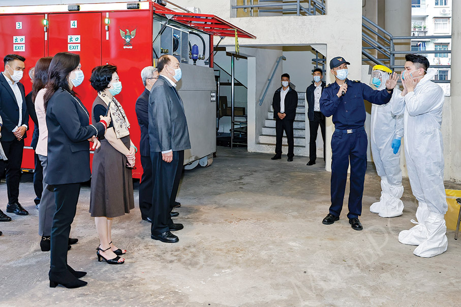 Chief Executive Ho Iat Seng (centre) attends a briefing about firefighters’ hazmat suits during a visit to the Central Station of the Fire Services Bureau (CB) on Sunday. According to a statement by the Macau Government Information Bureau (GCS), Ho visited a number of neighbourhoods, community and social welfare facilities, shops, restaurants and government entities during Chinese New Year holiday, with special emphasis on the public administration’s frontline staff. GCS