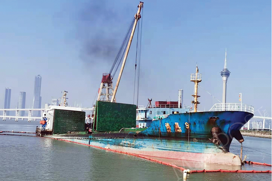 A cargo ship that was seriously wrecked in a crash with another cargo vessel late last month off the Macau Science Centre (MSC) in Nape was removed from the area on Wednesday night after it was jointly salvaged by its owner and the local government, the Marine and Water Bureau (DSAMA) said in a statement yesterday.