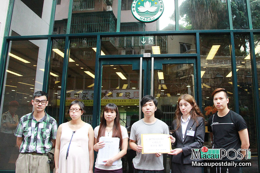 Members of the New Macau Gaming Workers’ Rights Union, Caring for Macau and Macau Gaming Industry Frontline Workers (FMG), including well-known activists Ieong Man Teng (third from right) and Cloee Chao Sao Fong (fourth from right), hand the groups’ petition to an official outside Government Headquarters yesterday.