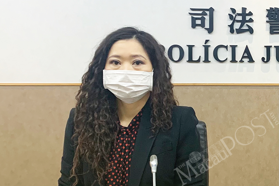 Judiciary Police (PJ) spokeswoman Lei Hon Nei poses during a regular press conference at the PJ headquarters yesterday. Photo: Camy Tam