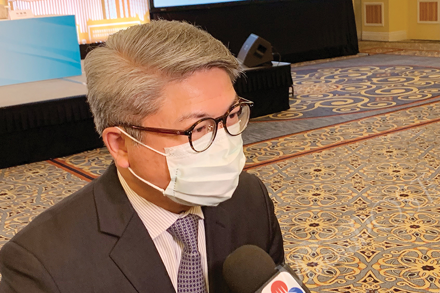 Sports Bureau President Pun Weng Kun talks to reporters on the sidelines of yesterday’s 2021 Sands China Macao International 10K press conference at the Venetian Cotai. Photo: Prisca Tang