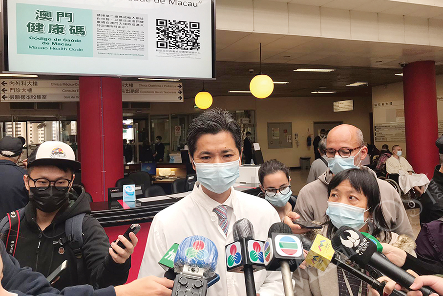 Tai Wa Hou, the coordinator of the Health Bureau’s (SSM) COVID-19 vaccination programme, speaks to reporters at the public hospital. Photo: Maria Cheang Ut Meng