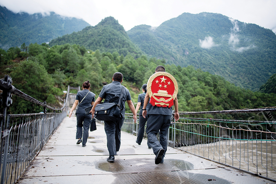Deng Xing, a judge of the People’s Court of Gongshan county, carries the national emblem on his back while walking with his colleagues on a bridge over the Nujiang River on their way to work in the Nujiang Lisu Autonomous Prefecture, Yunnan province, on August 30, 2019. – Xinhua