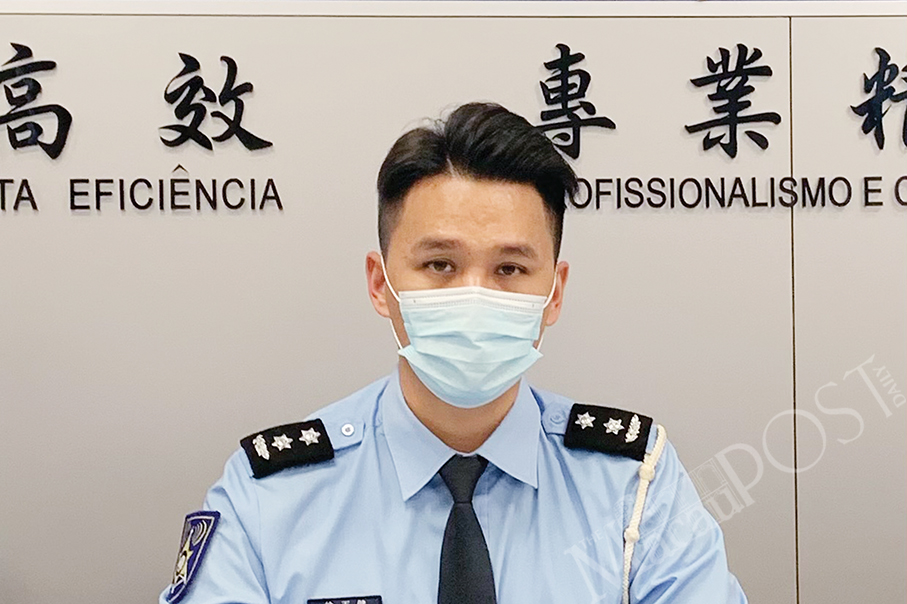 Public Security Police (PSP) spokesman Choi Iok Kin poses during yesterday’s regular press conference at the PSP pressroom. Photo: Camy Tan