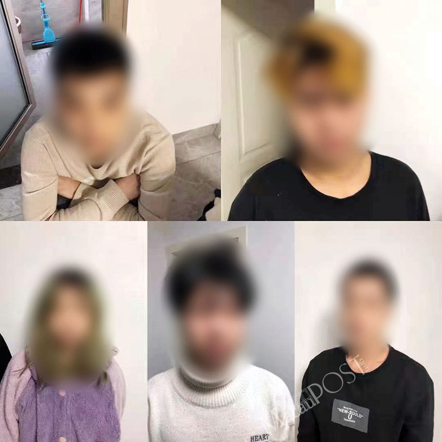 This undated handout photo provided by the Judiciary Police (PJ) yesterday shows five suspected gang members arrested by the mainland’s Public Security Bureau (PSB) late last year. The suspects’ faces were pixelated by the mainland police.