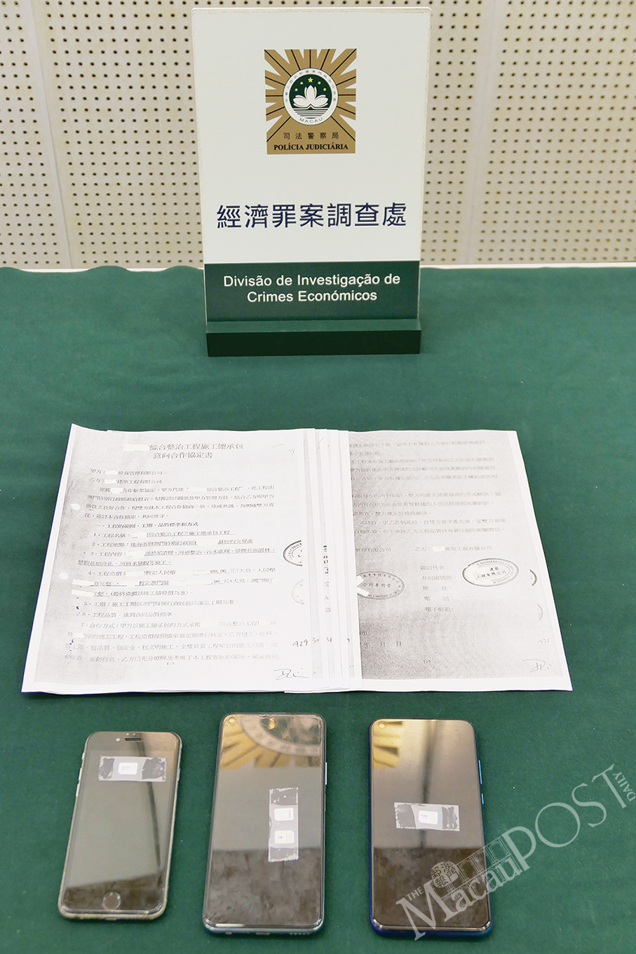 Evidence seized from the suspect such as forged documents and three smartphones is displayed at the Judiciary Police (PJ) headquarters yesterday.