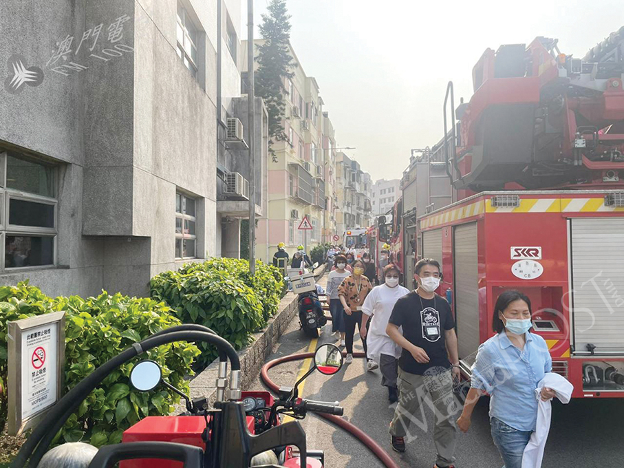 Staff members of the Health Bureau’s (SSM) Public Health Laboratory self-evacuate after the hilly area outside the building was ablaze yesterday. Courtesy: TDM