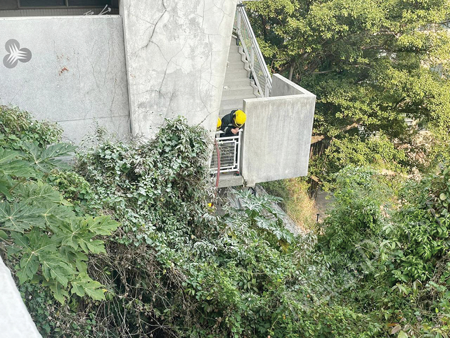 When several Health Bureau equipment maintenance workers were welding the railings at the laboratory’s outdoor fire escape staircase at around 3 p.m., a gust of wind blew up the welders’ protective board, because of which sparks caused by the welding equipment reached the hilly area and set fire to leaves and shrubs there, the statement said.