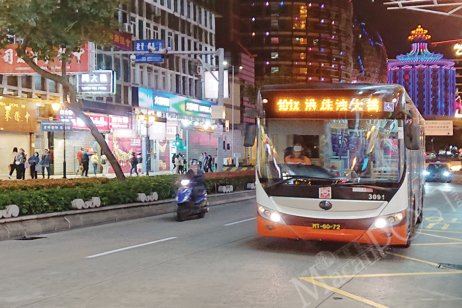 A public bus on the 101X route serving the Macau checkpoint of the Hong Kong-Zhuhai-Macau Bridge (HZMB) drives through the city centre last night. The 24/7 101X route, which connects the city centre and the HZMB Macau checkpoint, is one of the city’s two public bus routes serving the HZMB Macau checkpoint, with the other route being 102X – which travels between the Macau-side checkpoint zone of the Macau-Hengqin joint checkpoint and the HZMB Macau checkpoint. Due to the very low number of travellers in the wake of the COVID-19 pandemic, public bus operator TCM has changed some of the 101X buses from large buses to small buses since early this month. Public bus operator Transmac has changed all the 102X buses from large buses to small buses since late last month. Photo: Tony Wong