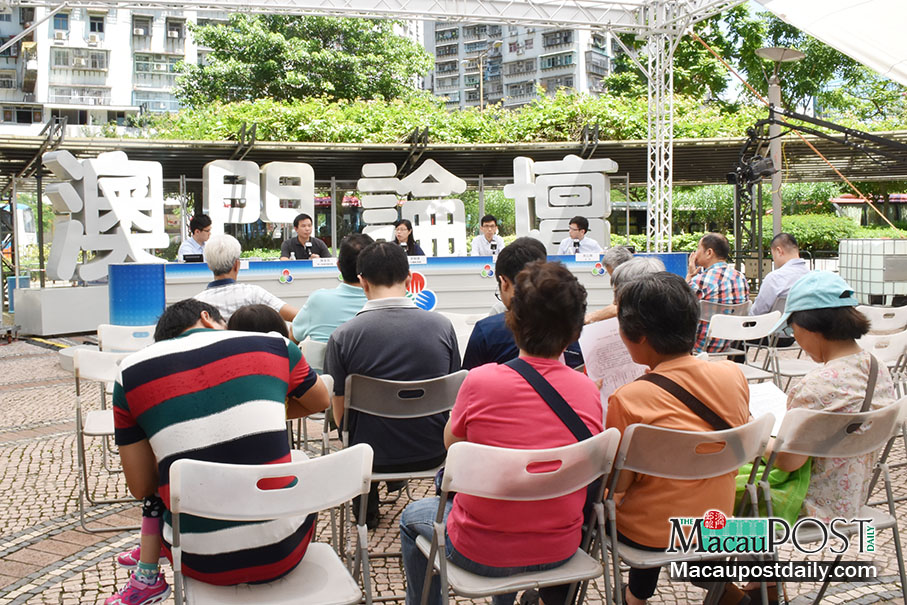 Over a dozen audience members attend yesterday’s open-air Macau Forum debate programme in Areia Preta Park. Photo: Leong Lok Ian