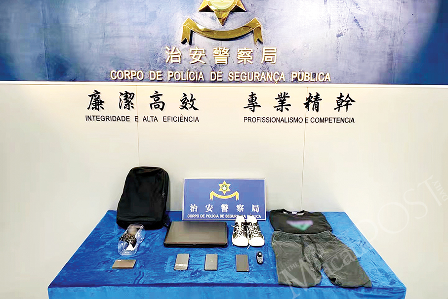 This undated handout photo provided by the Public Security Police (PSP) yesterday shows evidence seized from the suspect such as a Bluetooth remote control, a modified water bottle, a hard drive, a rucksack, a laptop, three smartphones and the clothes the suspect wore when taking the upskirt photos.