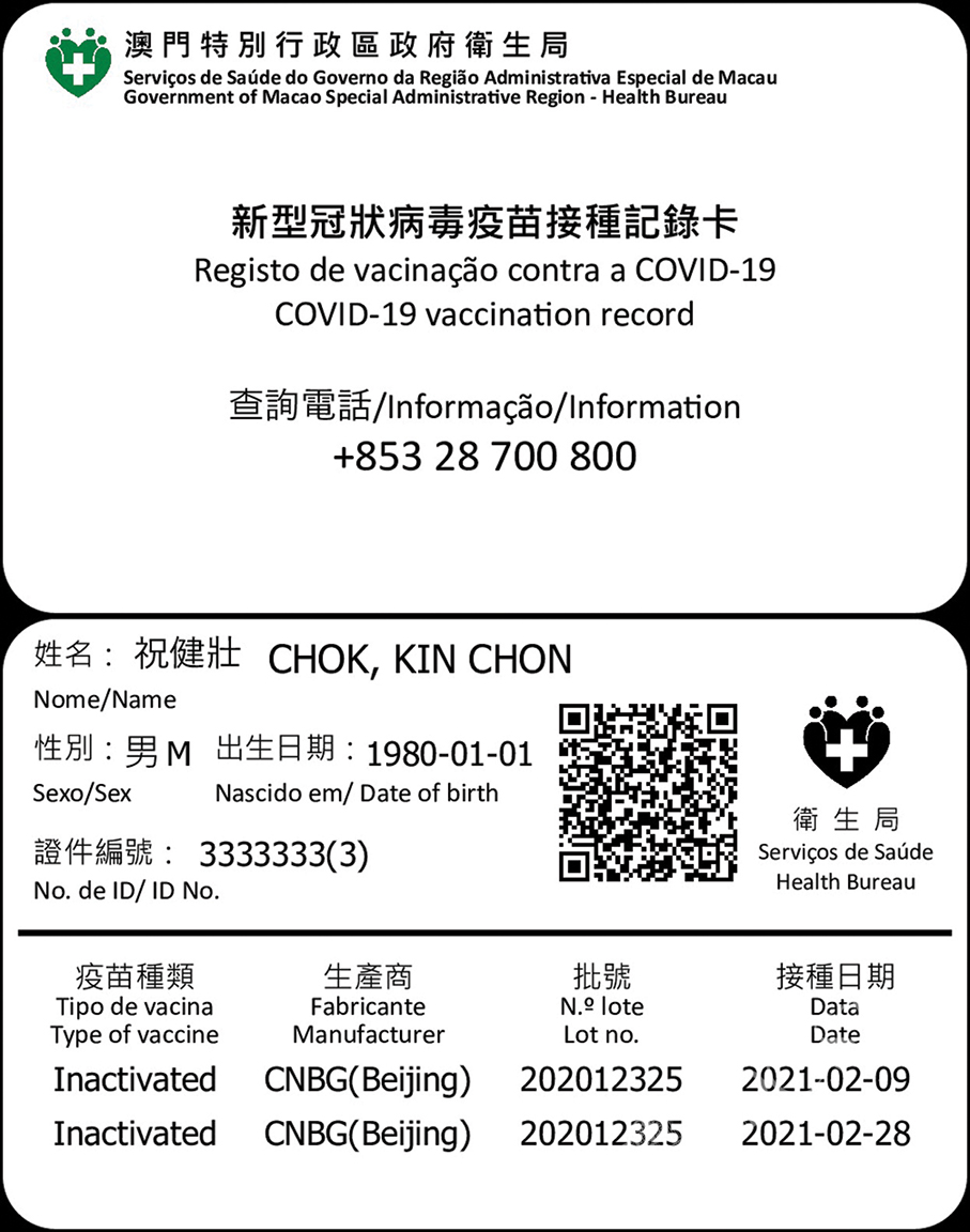 According to Tai, the COVID-19 vaccination record card displays its holder’s name and other personal information, the type of vaccine they have been given and its manufacturer, and the dates when they had the two jabs. All information is displayed in Macau’s two official languages – Chinese and Portuguese, as well as English. The card displays a QR code for its holder and others to scan so that they can check the details of the COVID vaccination record on digital devices.