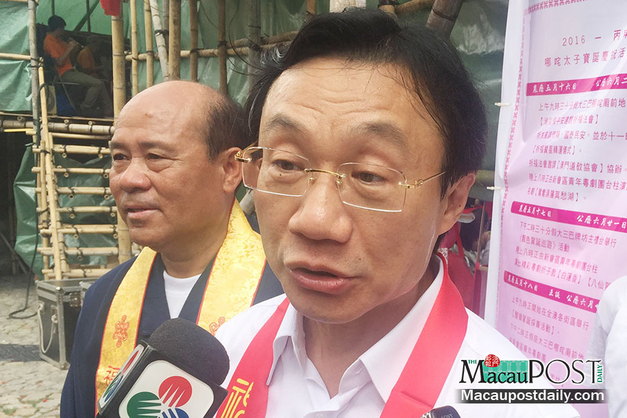 Secretary for Social Affairs and Culture Alexis Tam Chon Weng talks to reporters yesterday outside Na Tcha Temple next to the St Paul’s Ruins. Photo: MPDG