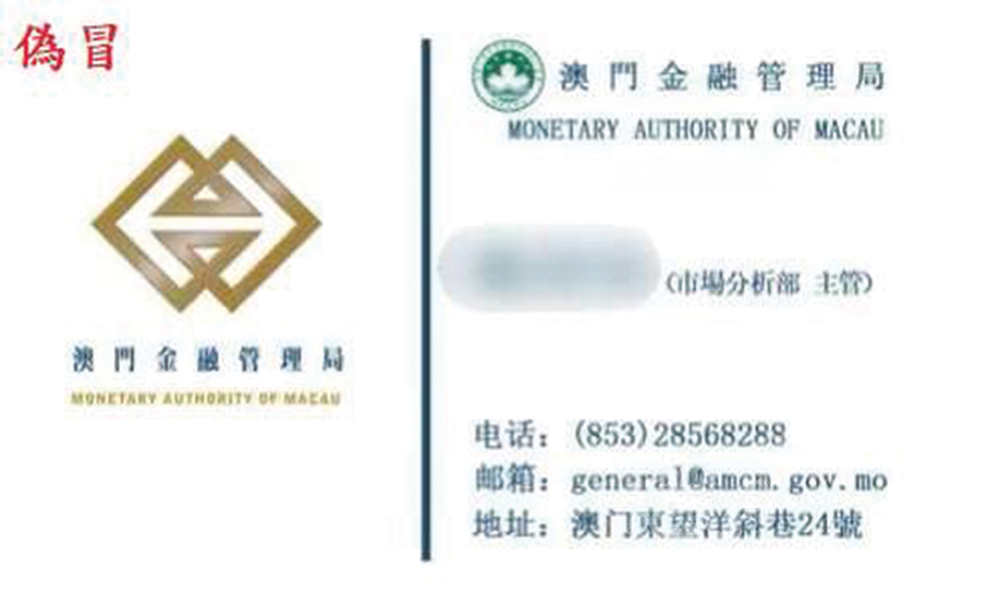 The Monetary Authority of Macau (AMCM) said in a statement yesterday that it recently received reports about netizens pretending to be AMCM staff by using a fake business card to sell investment products.