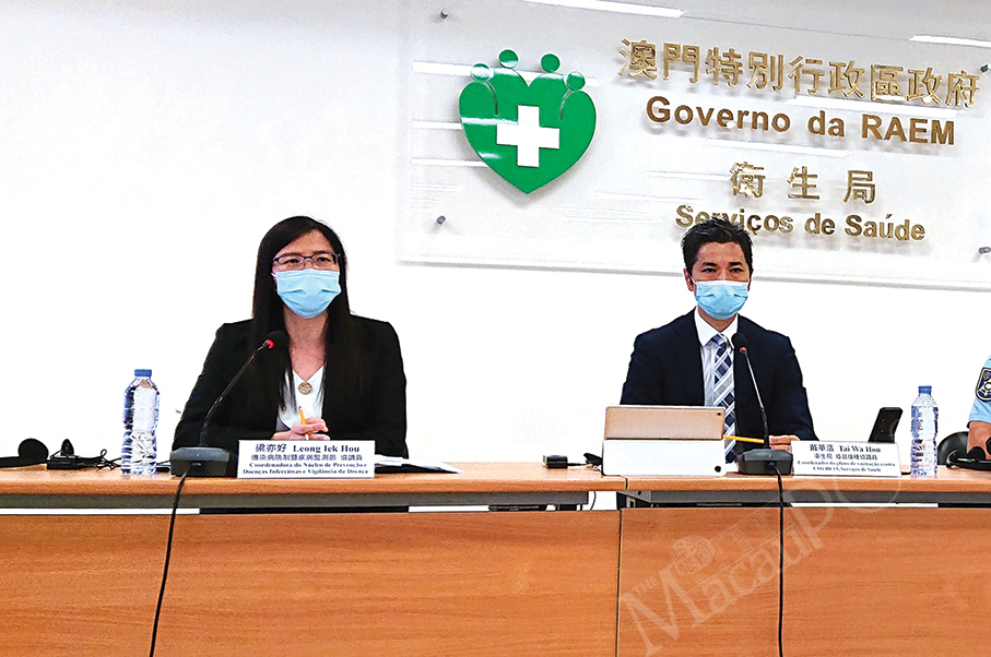 Health Bureau (SSM) Control of Communicable Diseases and Surveillance of Diseases Department Coordinator Leong Iek Hou (left) speaks during yesterday’s press conference about the city’s novel coronavirus (COVID-19) situation, as Tai Wai Hou, the coordinator of the bureau’s COVID-19 vaccination programme, looks on. Photo: Tony Wong
